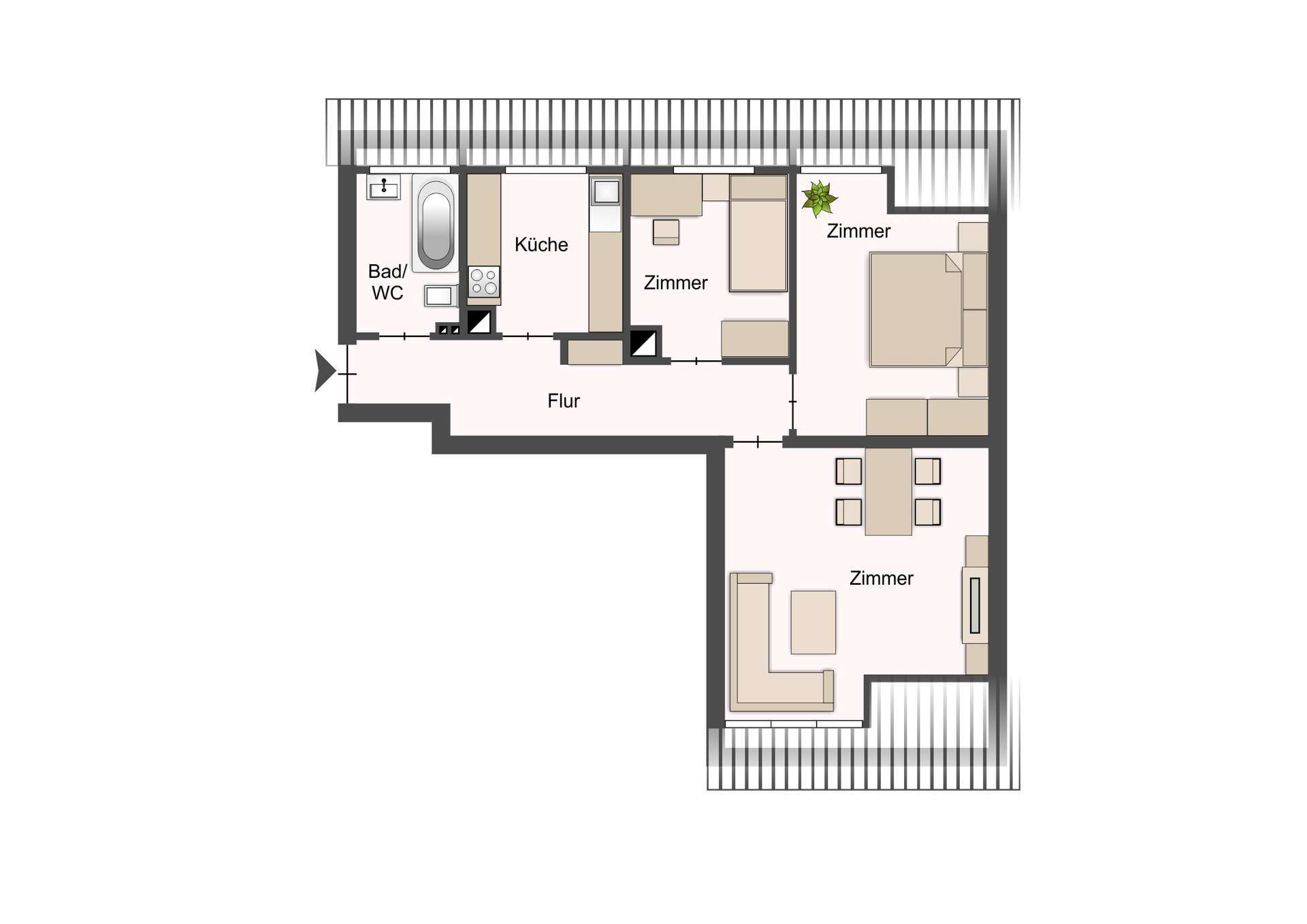 Diese 2-Zimmer-Wohnung im Dachgeschoss begeistert durch ihren besonderen Charme. Auf 59 m² Wohnfläche bietet sie ein helles Wohnzimmer, ein Schlafzimmer, eine Küche und ein Bad. Dachschrägen schaffen eine behagliche Wohnatmosphäre, die von vielen Mietern geschätzt wird.